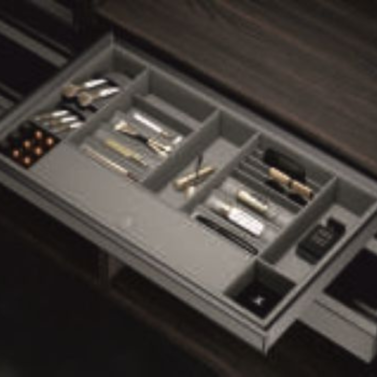 A sleek grey palette and sharp lines give the tray a contemporary aesthetic. Subtle accents enhance its refined appearance. Its compact form complements modern vanity and wardrobe interiors.