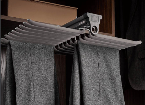 Dual parallel rows maximize trouser capacity while keeping each pair accessible. The sliding mechanism allows easy viewing and selection. It prevents wrinkling and saves space efficiently.