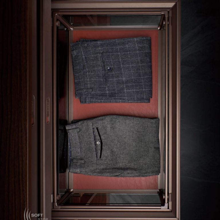 A sleek glass façade paired with metallic mocha-accented framing delivers a refined and contemporary aesthetic. The clean, structured look blends seamlessly into premium wardrobes, making the basket both a functional tool and a style-enhancing feature.
