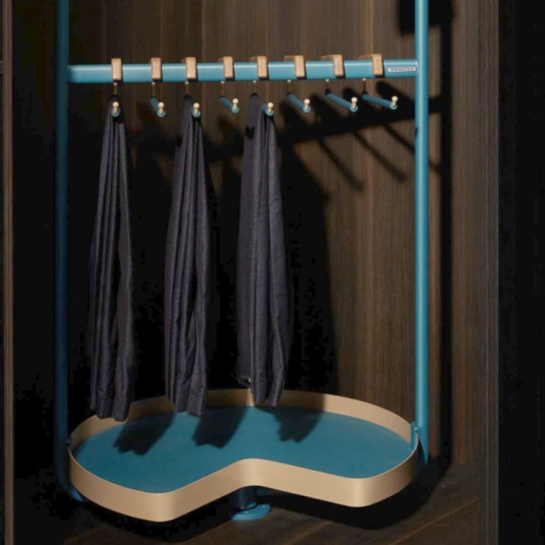 With a modern curved form, enhanced by premium finishes, it adds elegance and innovation to the wardrobe interior. The design balances minimalism with functional aesthetics.