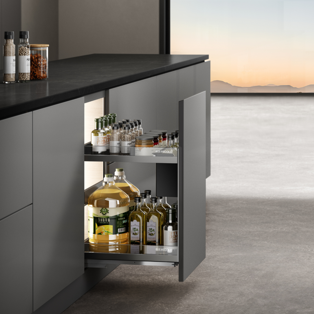 With a clean, refined appearance and subtle metallic detailing, the unit adds sophistication to compact storage zones. Its minimal profile blends seamlessly with modern kitchen interiors, enhancing both style and function.